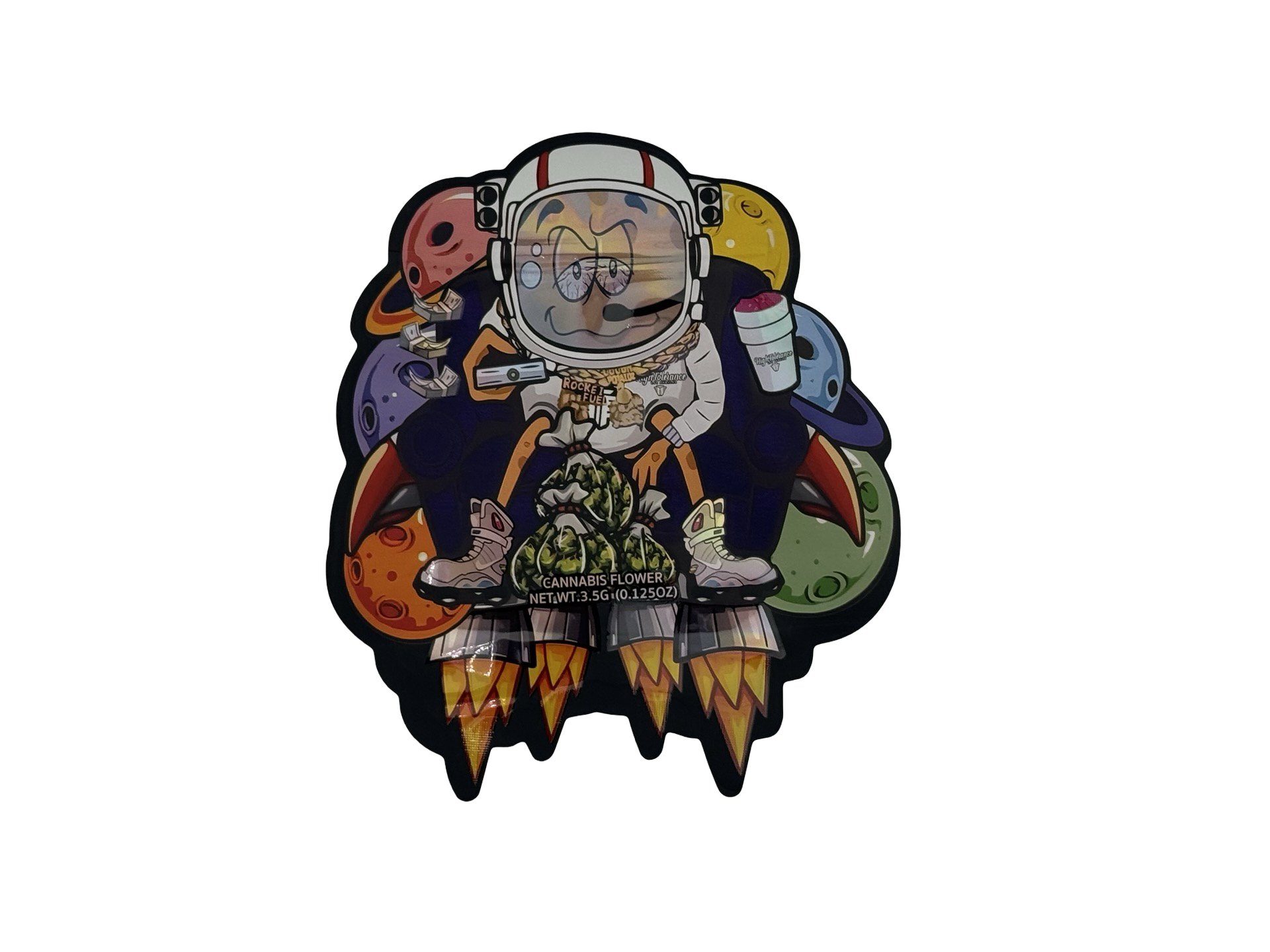 - Finish: matte mylar bag with spot holographic UV accents