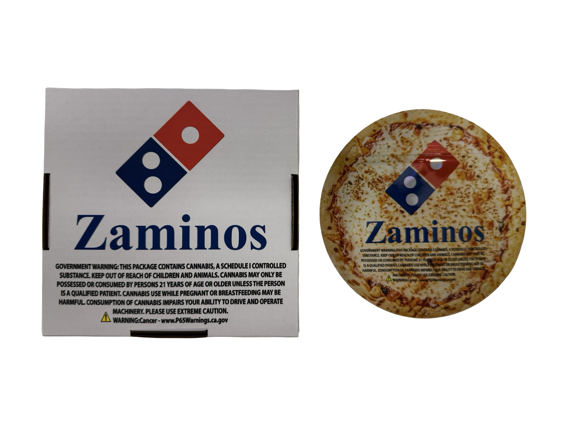 Zaminos 3.5g Mylar Bags & Boxes — matching set with a 3.5g mylar bag and a custom folding pizza box. The bag is smell‑proof (odor‑proof), heat‑sealable, resealable, and tear‑notch ready; the box ships flat and folds in seconds.